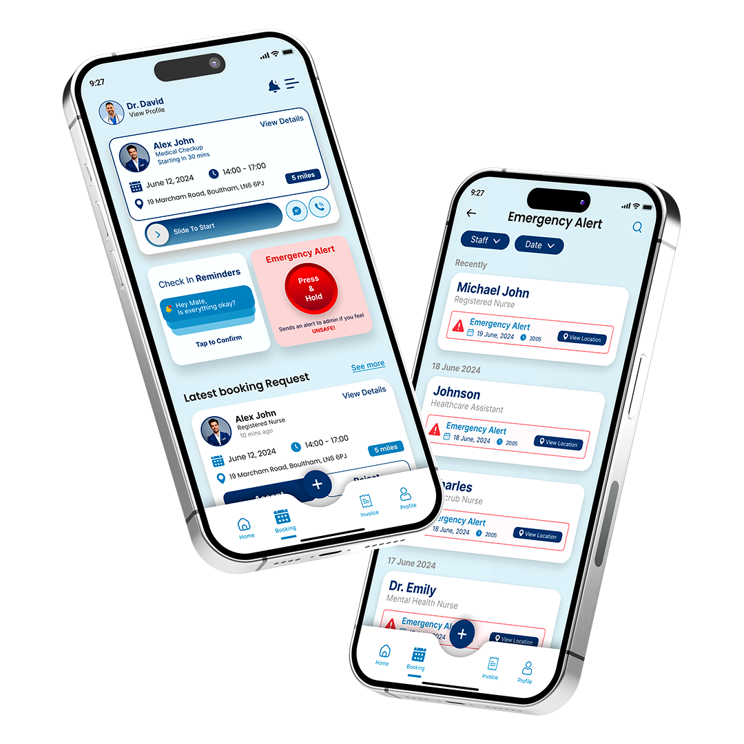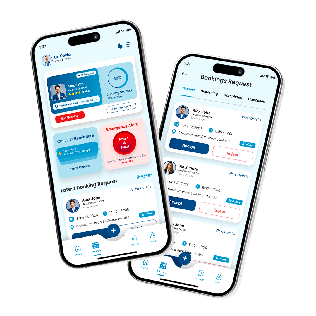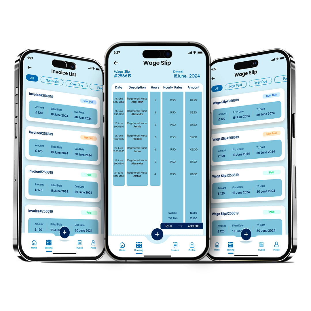 Offer your clients a seamless way to manage their services. With our app, clients can review staff profiles, check qualifications, and schedule bookings, all while keeping track of ongoing jobs in real-time. They can also view and pay invoices directly through the app, eliminating any hassle with billing. It’s designed to give clients control and transparency, allowing them to manage their care services effortlessly.
